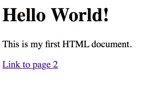 Below your paragraph tag on the index.html page add the line <a href=”page2.html”>Link to page 2</a>.