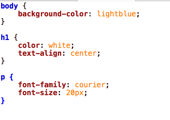 Our style instructions for each tag are enclosed in { }. These are called declarations. We can add as many style declarations as we would like in between the brackets, separating each with a semicolon. Each declaration has a property followed by a colon and then a value.