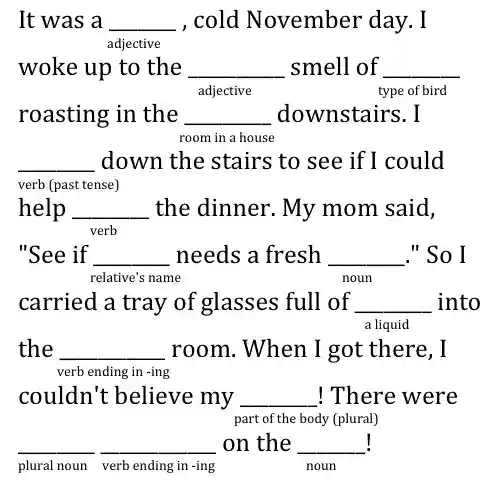 A mad lib is a word game that prompts you to supply words that are added to a template to generate a story.